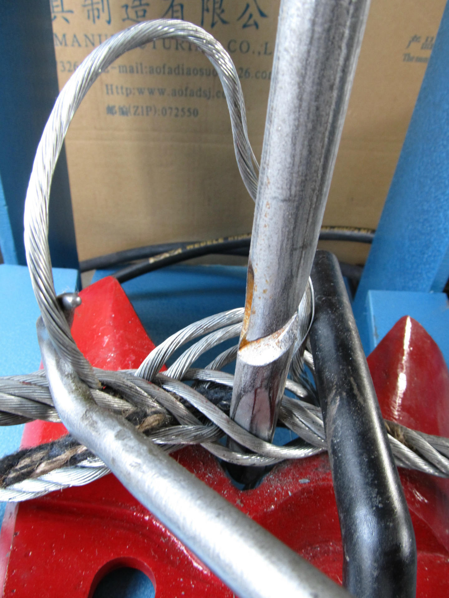 由于這種辦法使用的時(shí)間比較長,而且在人們心目中這種辦法深入鋼絲繩比較多,就比較安全。只是存在各方面的缺點(diǎn),人工費(fèi)用比較高,而且效率比較高,拿一個(gè)直徑20的為一人一天只能做20-30根,而鋼絲繩壓套機(jī)的效率非常高,十倍于人工。有人會擔(dān)心安全上不如人工,實(shí)際上,權(quán)威檢測證明,鋼絲繩壓制的安全性更高,費(fèi)用比插編要低,這種方法會慢慢被接受。