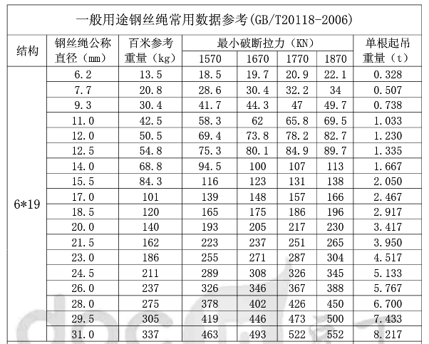 2、單根起吊重量:是指1670強度級的安全系數(shù)是6倍時的起吊重量。